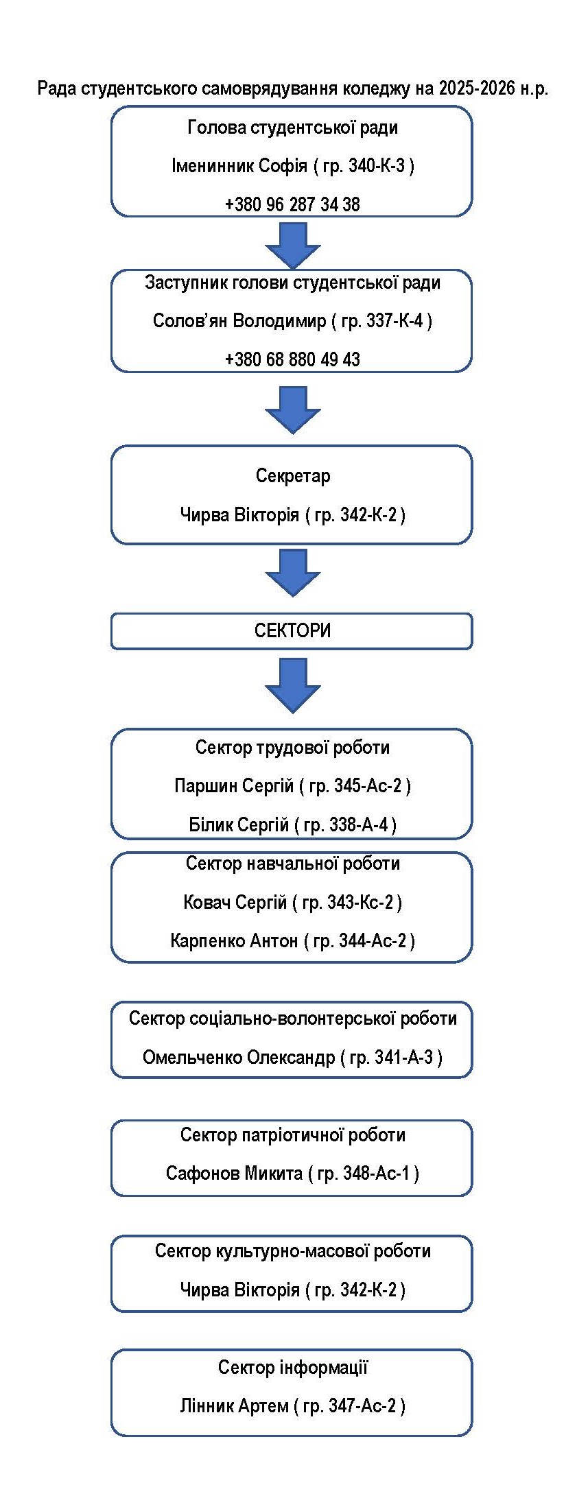 Студентська рада сприяє захисту прав та інтересів студентів, які навчаються в коледжі, проведенню навчально-виховної роботи та творчої діяльності, культурних та святкових заходів серед студентства, формуванню моральних та етичних норм, вихованню патріотизму.