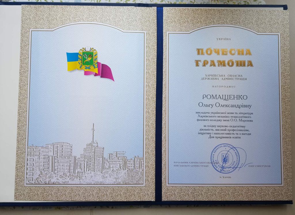 Почесною грамотою начальника Харківської обласної військової адміністрації за плідну педагогічну діяльність, високий професіоналізм і відданість своїй справі було нагороджено Ольгу Олександрівну Ромащенко, викладача української мови та літератури.