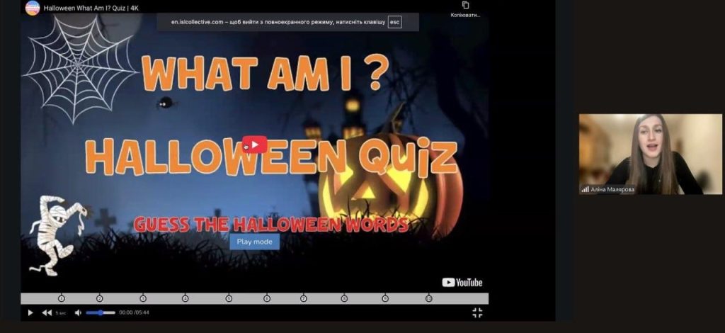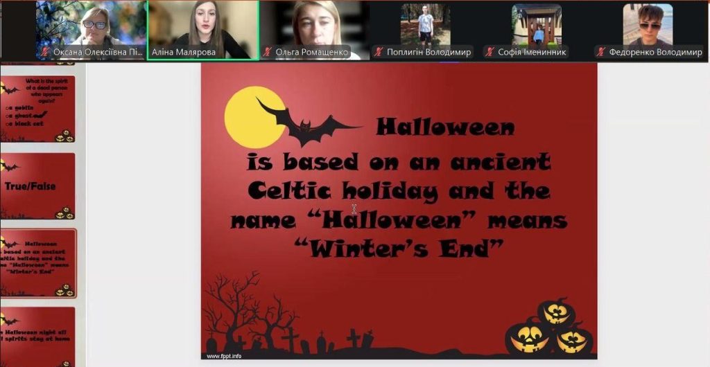 Інтерактивна гра “Getting to know the different cultures and traditions of the world” допомогла учасникам розширити світогляд і дізнатися багато нового про звичаї, традиції, свята та національні символи різних країн. Завдяки сучасним технологіям і творчому підходу викладача, заняття проходило в цікавій і невимушеній формі, що сприяло розвитку міжкультурної компетентності студентів. Особливу увагу під час інтерактивного заняття було приділено традиціям святкування Гелловіну. Студенти дізналися про історію походження свята, його символи, костюми, звичаї та сучасні способи святкування у Великій Британії, США та інших країнах світу. Учасники активно брали участь у вікторинах, іграх та обговореннях присвячені темі Гелловіну