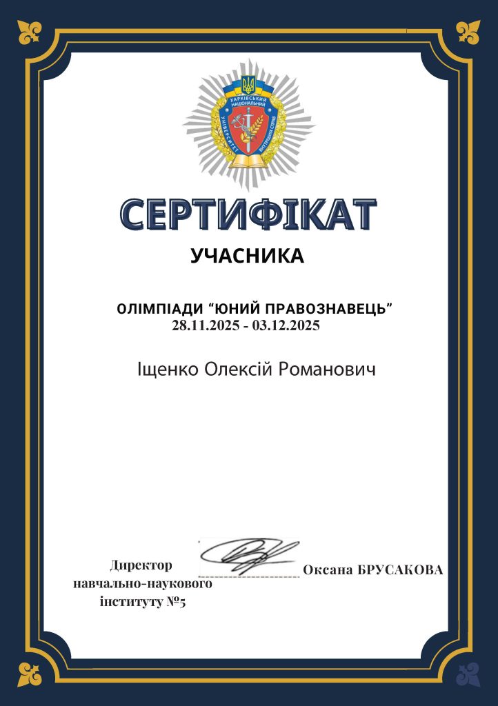 Щиро вітаємо Іщенка Олексія, учасника олімпіади з правознавства!