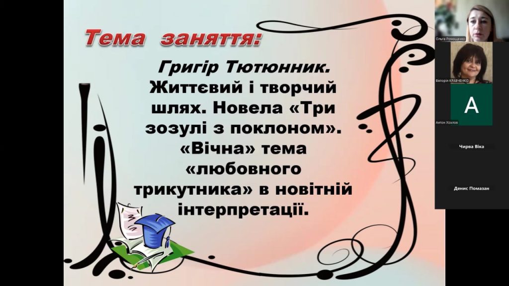Показове заняття – це методичний захід, під час якого відбувається презентація кращого досвіду, ознайомлення з новими педагогічними надбаннями і актуальними питаннями методики. У своєрідній школі кращого досвіду були присутні викладачі: Кравченко В.О., Малярова А.А., Легеза О.В., Лісовін О.Д. Підгорна О.О., долучившись 2 квітня 2026 року на платформі Zoom до інтерактивного комбінованого заняття з української літератури на тему «Григір Тютюнник. Життєвий і творчий шлях. Новела «Три зозулі з поклоном». «Вічна» тема «любовного трикутника» в новітній інтерпретації» в групі 342-К-2, проведеного викладачем вищої категорії Ольгою Олександрівною Ромащенко.